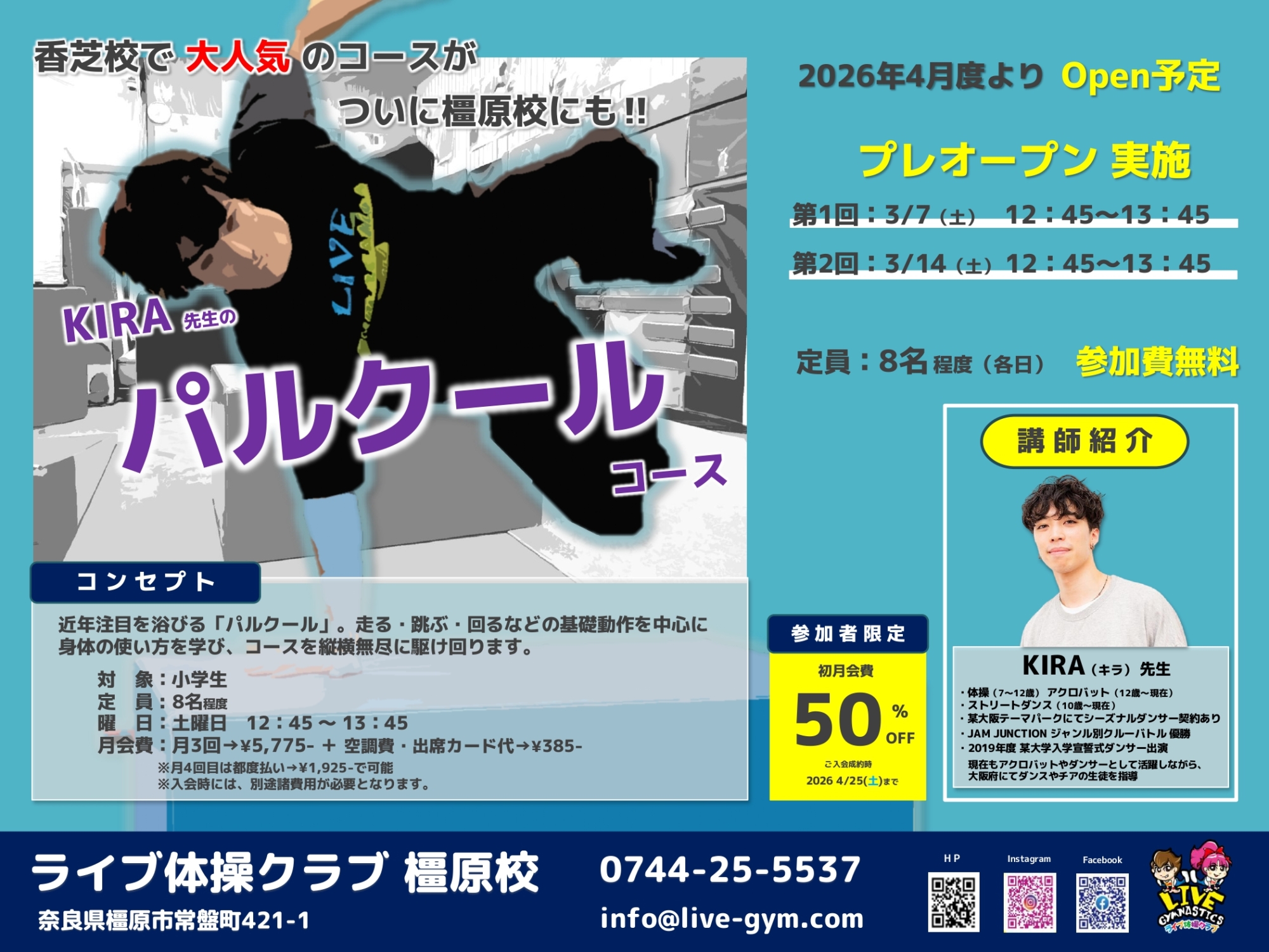 今回は香芝校で大人気の「パルクール コース」も初めて開催します!